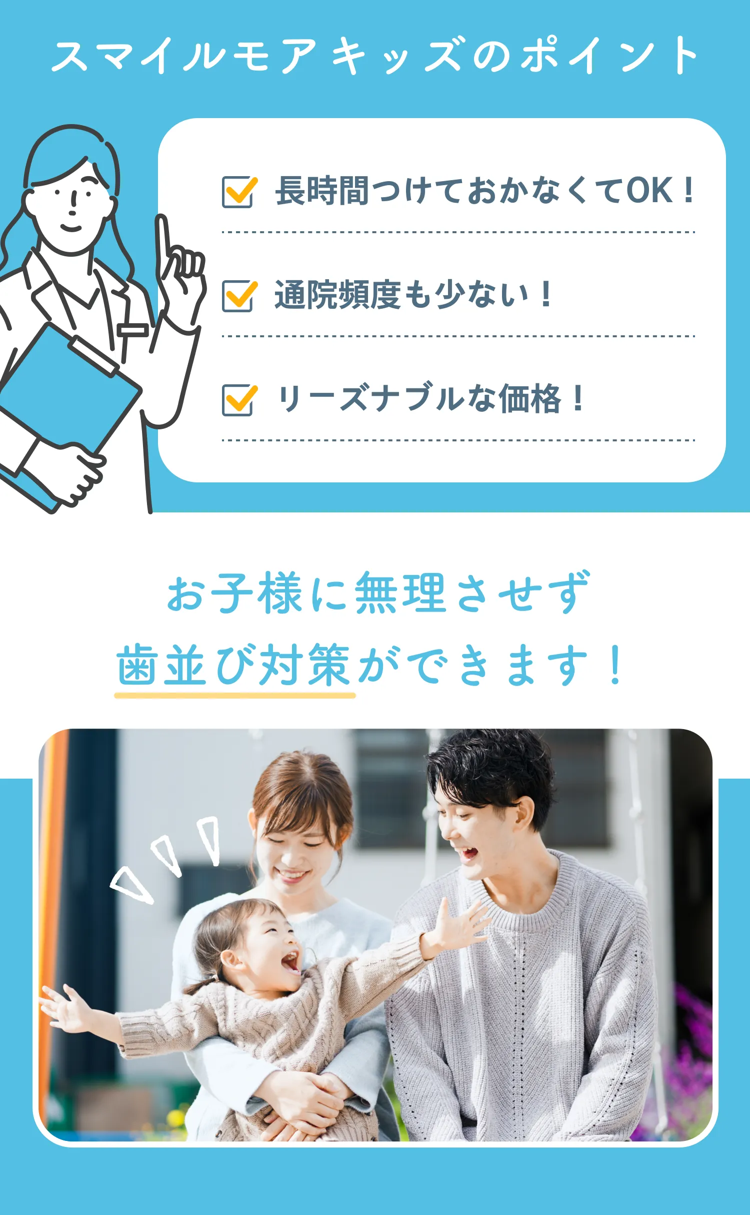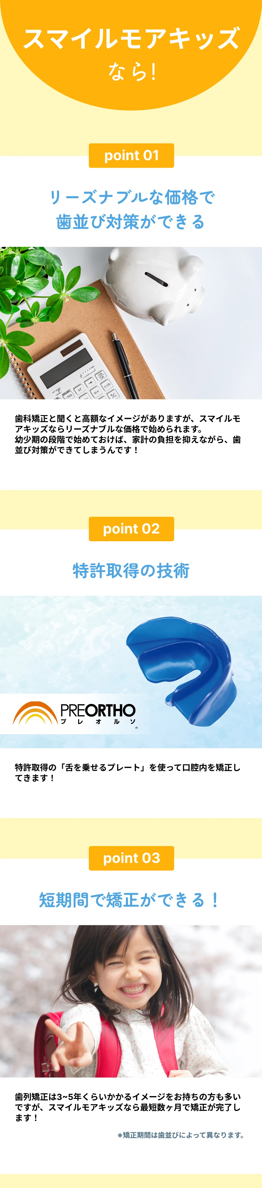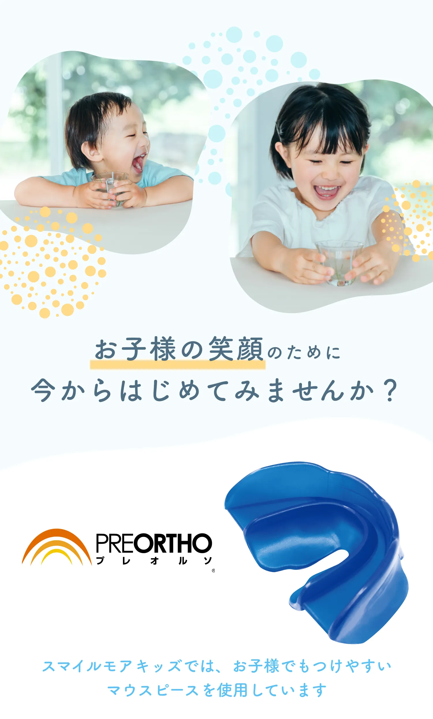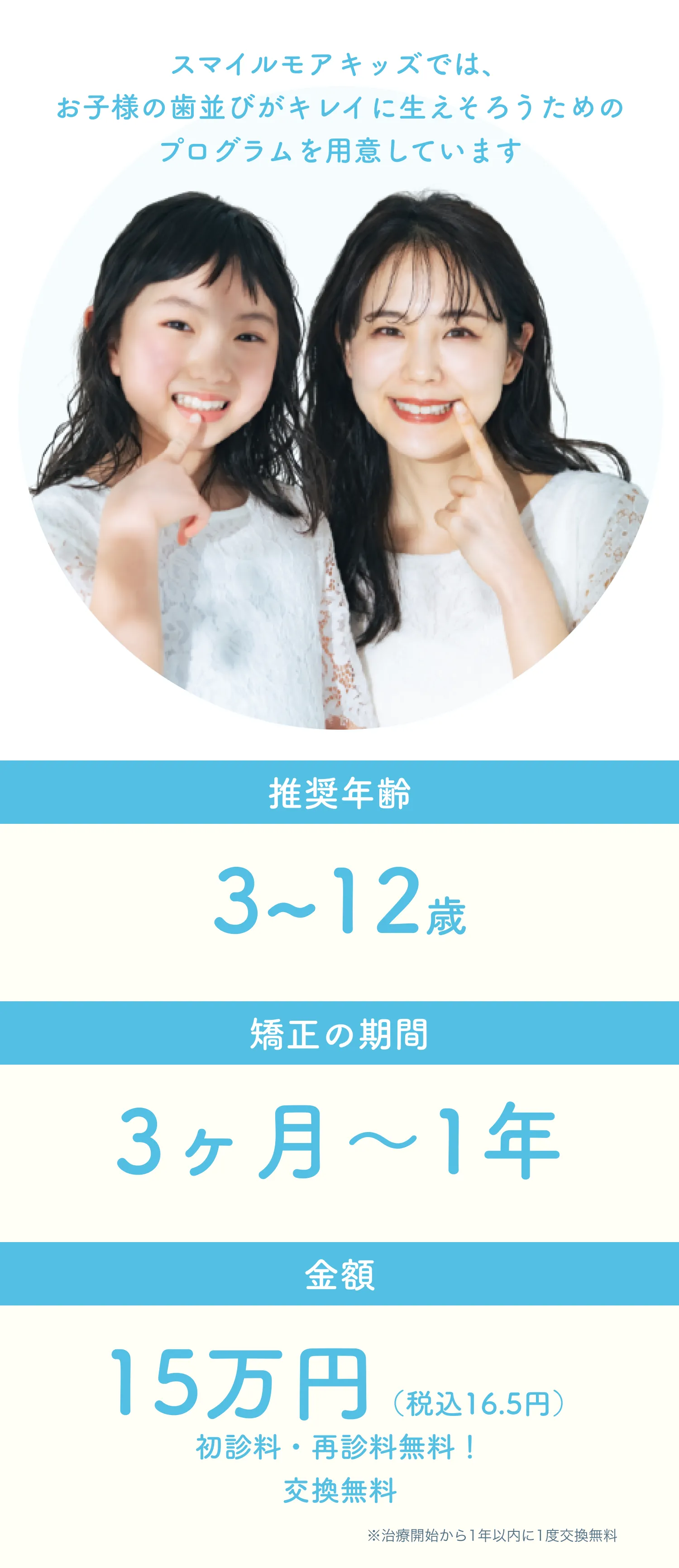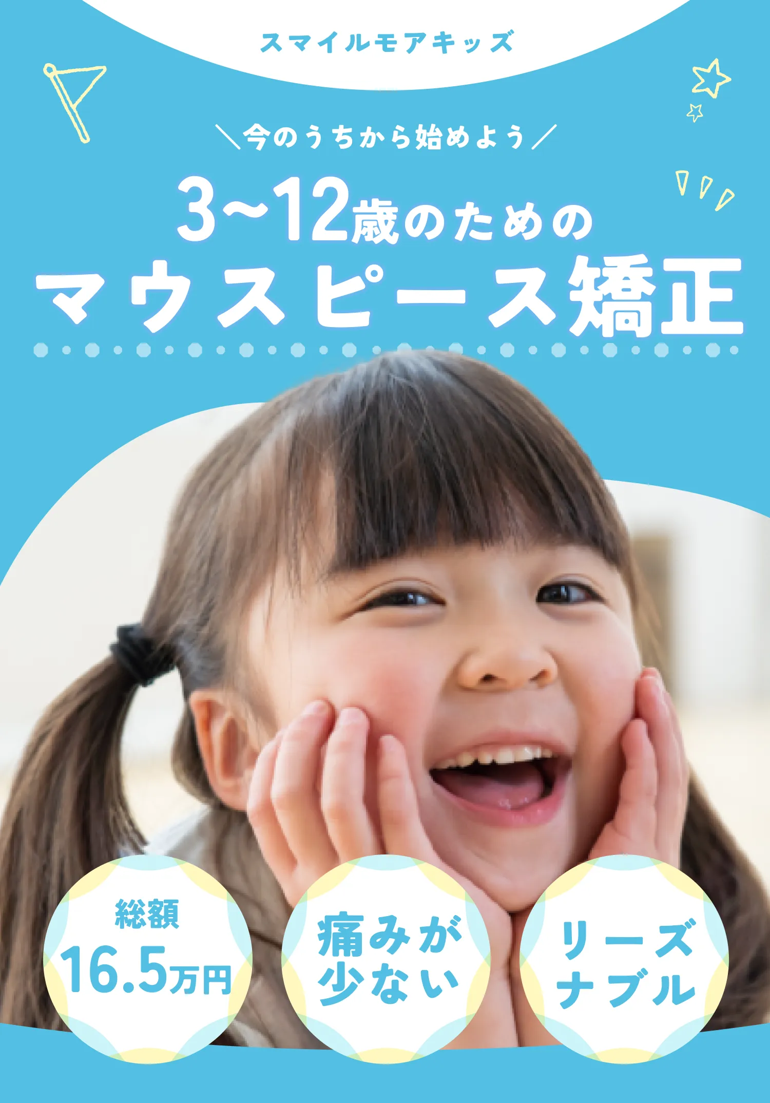 ・全ての矯正方法に共通することとして、治療時の効果やその感じ方、実際の歯の移動距離には個人差がございます。 どの矯正方法を選んだ場合にも、ご希望通りに歯が動かない可能性があります。スマイルモア矯正は提携医院と協力して、皆様が「自信を持って思いっきり笑える」理想の歯並びを手に入れられるように全力でサポートいたします。