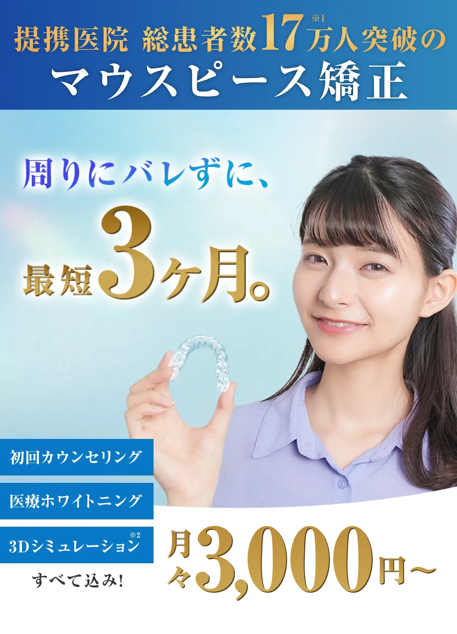 ※患者さんの年齢や口腔内の状況によってはリスクの観点からホワイトニング剤をご提供できない場合がございます。 ※ホワイトニングサービスは矯正治療契約時のみ。ホワイトニング費用は支払い総額に含まれます。 ※症状やご希望の治療内容によっては、この範囲を超える費用が発生する場合がございます。